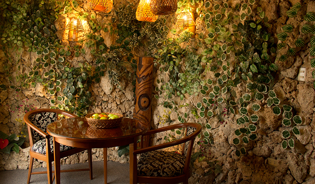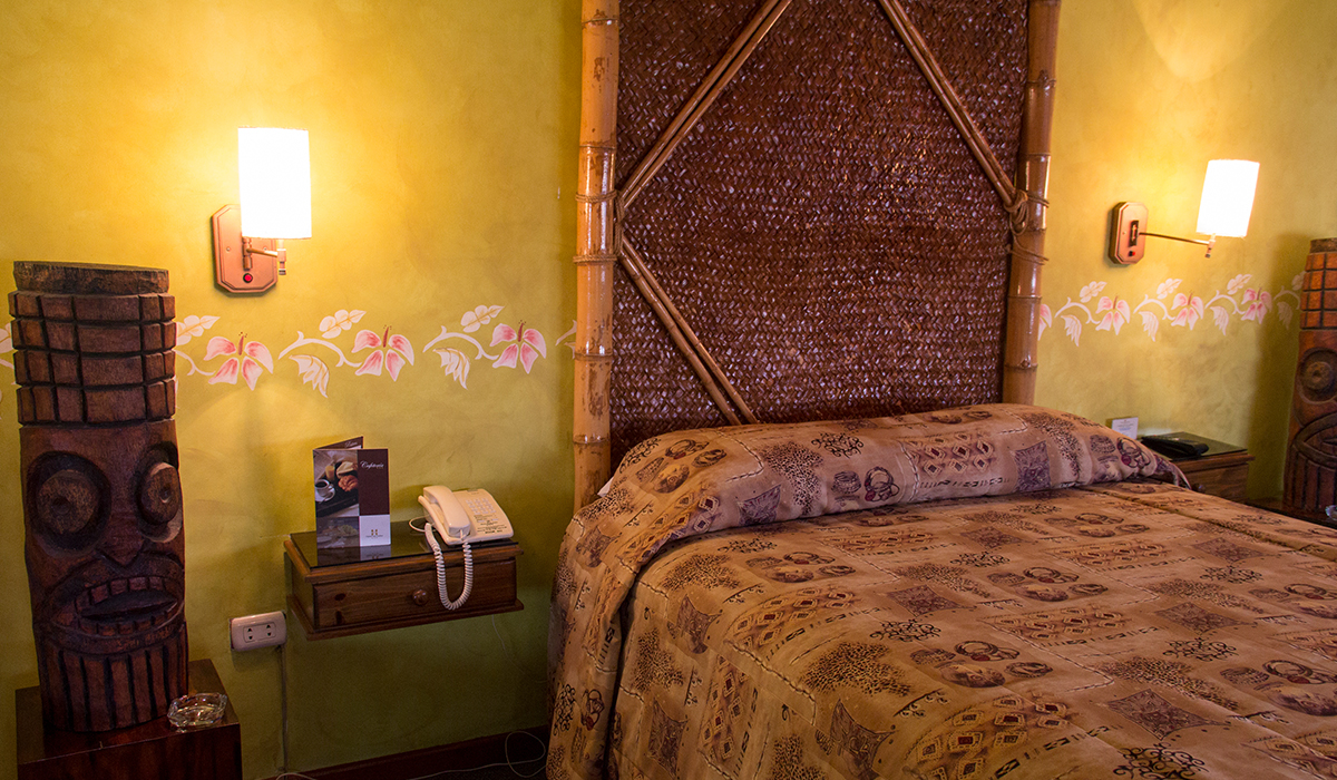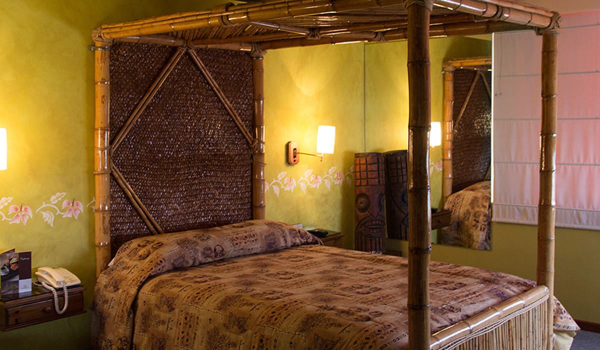 "Paradisiacal decoration inspired by the famous American state"Bed with ceiling in true caribbean style, totem, stone wall